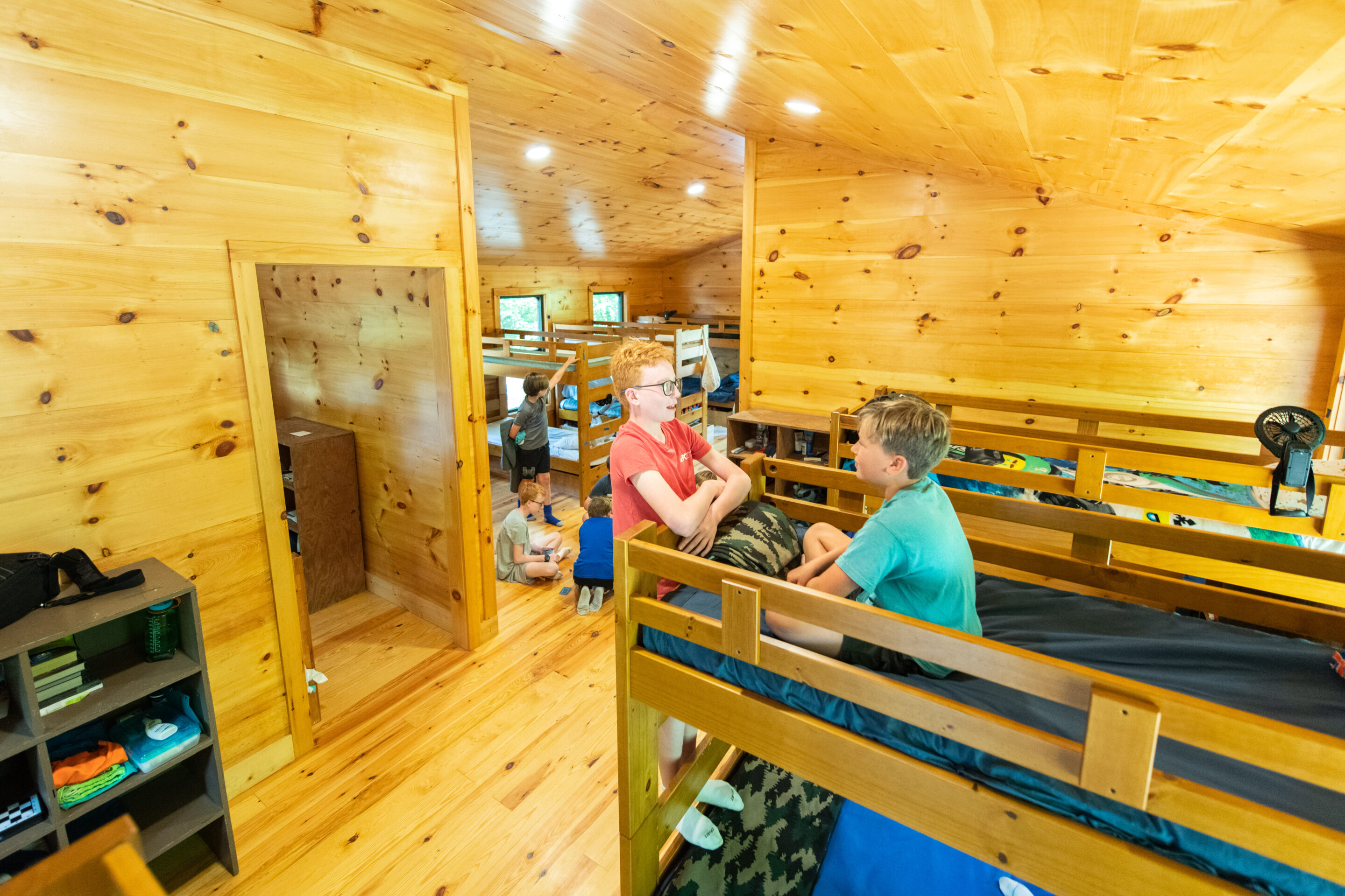 Timberlake has 14 cabins that are divided up into three cabin areas. All of our cabins typically have 3 staff members. Junior and intermediate camp cabins usually have around 10 boys, while senior camp cabins have 15. Timberlake’s program is designed to experience community in small, medium, and large groups and our cabins are where that small group community is formed.